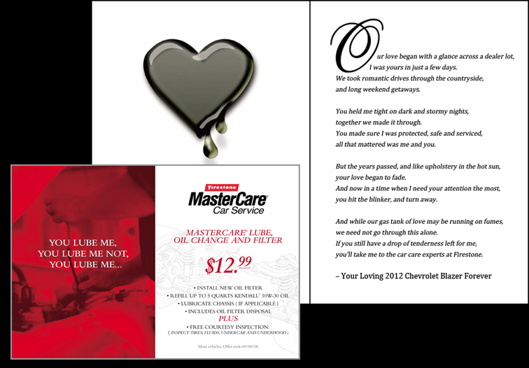 Direct mail for Firestone Complete Auto Care. Car owners were sent a Valentine’s Day Card personalized with their make and model of vehicle. Included were inserts that promote automotive services.