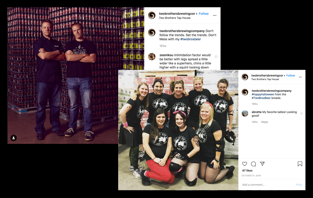 Social content provides opportunities to brand the brothers and promote sponsorships (like roller derby), plus it encourages beer lovers to find creative ways to make sure nobody messes with their Two Brothers.